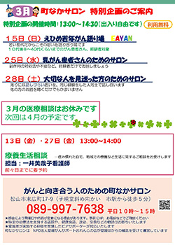 がんと向き合う人のための町なかサロン 松山市末広町17-9 089-997-7638 (松山市駅から徒歩7分、子規堂斜め向かい)