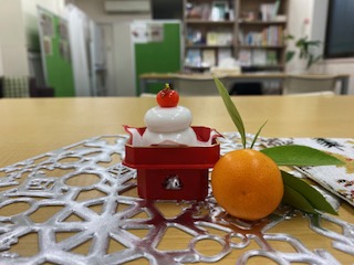 高さ5センチほどのガラスでできた鏡餅と、本物のみかん。